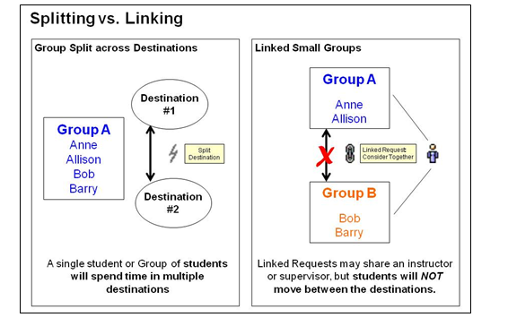 - Mandatory Rotation: the split will be used on every shift; reduce the destination group size in the primary request to indicate 4 students only will be present at any one time on the primary request).