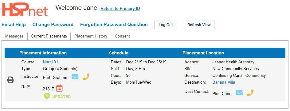 Upon successful login you will be directed to your Welcome Screen and a display of current placements: