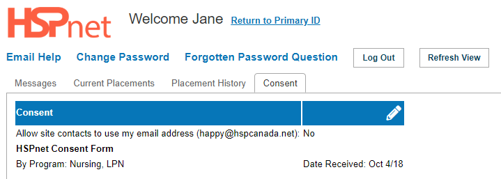HSPnet is a web-based system for coordinating student placements.  Students can access HSPnet in their province to view and print information about their upcoming placements, to communicate with key contacts, and to view or print placement details and schedules. Students can also consent to releasing their school based email address.